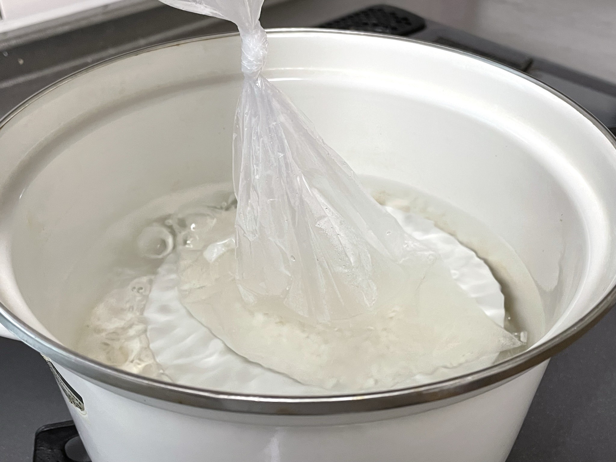パッククッキングは、高密度ポリエチレン製の袋で湯せん調理をする方法です。ポリ袋に、無洗米(1人分100ml)と水(お米の容量の1.2倍、1人分約120ml)を入れ、沸騰した鍋で湯せんします。
